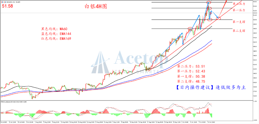 从上图白银4小时图来看,白银近期的走势非常强势,高低点的排列呈现出明显的多头趋势特征,且银价目前已创出新的历史高点至53.51,这表明白银后市继续上涨的概率较大。从均线上来看,白银目前明显位于关键均线EMA144和EMA169上方运行,且MA60均线也为银价提供了持久的支撑,这也表明白银当前处于偏多的格局中。上图中画出了白眼目前面临的重要支撑位,压力位以及预期的后市走势图,预计日内白银将在短暂回调后继续上涨,故操作上建议以逢低做多为主。