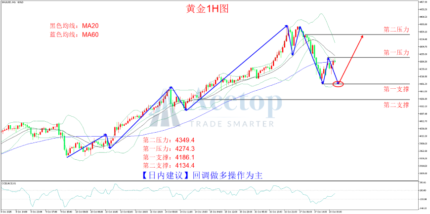 上图为黄金1小时图。由于前期大幅上涨,行情强势上行,并创下历史新高4379.1附近,随后价格多次上探不破,最终产生结构性调整,目前价格下穿多根均线形成1小时级别回落,但上行趋势在基本面的利多支撑下,仍有多头驱动因素,同时价格在1小时级别经过回落超190美金后,目前受布林带下轨支撑,同时CCI指标从超卖区间附近拐头向上,或预示短期行情将有所上行。日内操作上建议逢低布局多单思路为主。