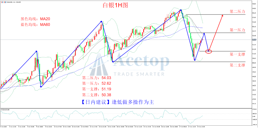 上图为白银1小时图。当前价格经过前期大幅上涨,上行达到最高点54.38后开始回落,本轮回落是对前期暴涨的修正,所以回落力度非常大,速度非常快。但日线、周线级别上行趋势尚未改变的情况下,仍有机会企稳,同时布林带下轨拐头向上,叠加CCI指标在超卖区间附近拐头向上进入0轴附近,或预示短期行情将上行,操作上可关注逢低布局多单思路。