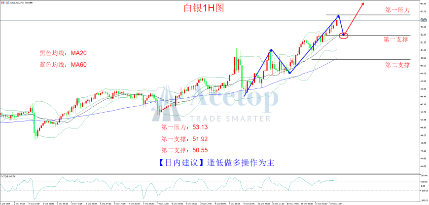 多单:建议51.92附近尝试做多,止损51.70,目标53.13-53.45附近。