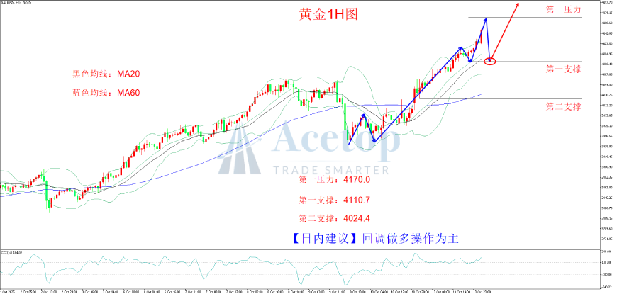 上图为黄金1小时图。图中可见,价格自前期低点4044.0附近起涨后,呈现不断攀升的多头趋势,价格上穿均线MA20和均线MA60,随后受均线MA20支撑一路上行,可见价格对均线MA20较为敏感。下方可关注该均线对价格的支撑。CCI指标在超买区间附近拐头向上,表明行情短期或进一步上行。日内操作上建议逢低布局多单思路为主。