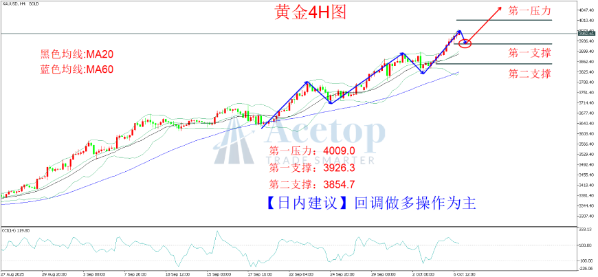 上图为黄金4小时图。图中可见,黄金价格目前保持多头强势的上行趋势,随着价格上行,均线系统MA20和MA60也同步上移,且呈现多头排列,显示行情当前多头动能充足。下方建议关注布林带中轨和均线MA20对价格的支撑。CCI指标在超买区间附近拐头向下,或预示行情短期有回调机会。日内操作上建议逢低布局多单思路为主。