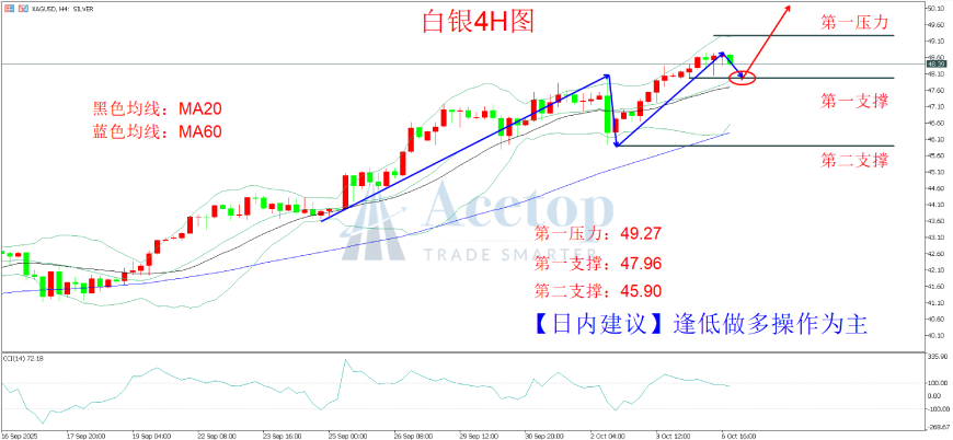 上图为白银4小时图。图中可见当前白银价格自低点拉起后,保持强势多头趋势,同时均线呈现多头排列,价格在均线MA60上方移动,显示多头动能充足,银价仍有机会进一步上行。下方关注布林带中轨和均线MA20对价格的支撑。CCI指标在超买区间附近运行,或预示行情有机会进一步上行。操作上可关注逢低布局多单思路。