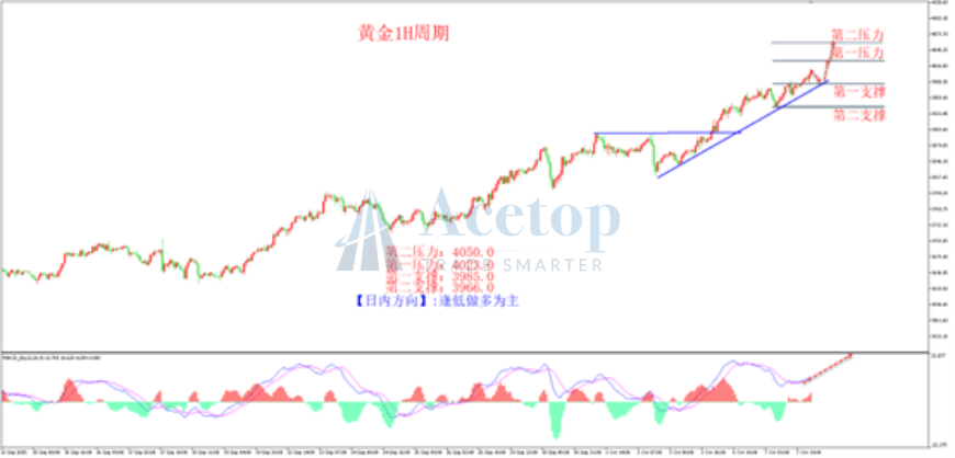 上图为黄金小时图。从形态上看,金价沿着上涨支撑线不断向上运行,多头走势良好,早盘金价多头再次突破4000美金大关口,打开上涨空间,延续多头浪走势。从k线角度看,黄金多头都是连续阳线上攻或大阳线上攻,表明多头力度非常强势,后市继续看多头上涨。从下方MACD指标来看,快慢线0轴上方运行,表明多头力量主导行情,短线快慢线金叉形成,表明多头要展开一波上涨浪。策略上建议顺黄金多头思路找支撑位埋伏多单思路为主。