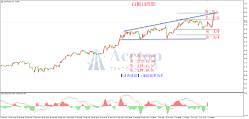 上图为白银1小时图,从结构上看,白银处于标准上涨浪行情当中,多头趋势不改。局部多头临近历史压力位附近开始反复高位震荡,构建了宽幅喇叭形形态,短线上边压力位,形态下边支撑位,多空区间内反复震荡。早间47.50支撑位突然开始上涨,表明多头强势,后市依然看新高走势。从下方MACD指标来看,快慢线0轴上方运行,表明多头主导行情走势,短线快慢线低位金叉信号形成,表明多头展开一波上涨浪节奏。策略上建议顺多头浪走势找支撑位埋伏多单思路为主。