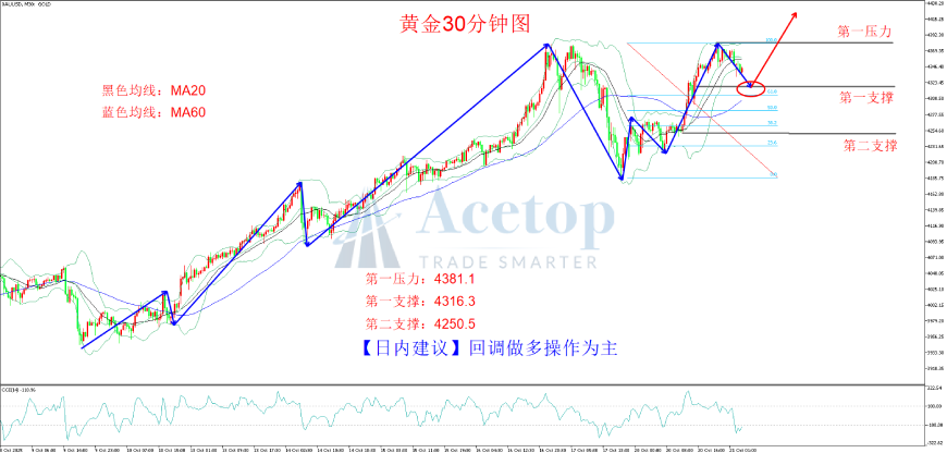 上图为黄金30分钟图。图中可见,价格连续攀升,创下历史新高4379.0附近后,进行了跌幅超190美金的回调,随后再次展开上行,价格向上突破均线系统,并再创4381.1附近高点,随后在30分钟图中形成短期回调,但这次回调延续了当前强势格局并破了新高,调整结束后或将延续上行。同时均线MA60和黄金分割线61.8%的位置共同对价格在4316.3附近形成支撑,CCI指标在超卖区间附近拐头向上,或预示短期行情将延续上行。日内操作上建议逢低布局多单思路为主。