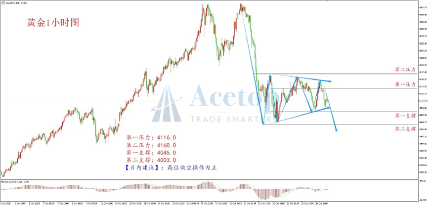 上图为黄金1小时图。从波浪来看,黄金自上方4380-4003一线完成了A浪下跌,当前处于B浪盘整阶段,可尝试布局C浪下跌。从形态来看,经过震荡收敛,黄金形成下降旗型形态。从下方MACD指标来看,量能再度进入零轴之下。操作上建议逢高布局空单思路为主。
